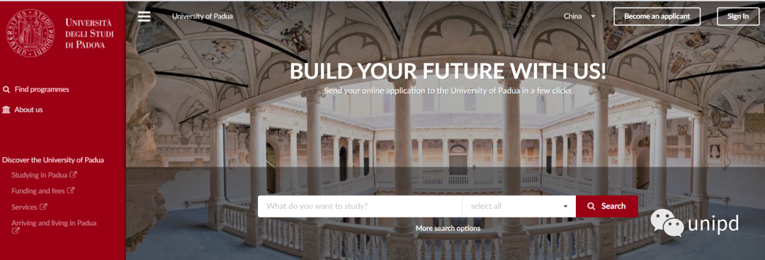 请阅读各专业的入学须知,知悉选拔条件。然后请点击界面上“Become an applicant(成为申请者)的按钮并进行注册。请注意填写正确的电子邮箱,同一个申请者不要用多个邮箱注册,否则可能申请出错。使用电子邮箱收到的申请人号码(applicant code)进行登录(Sign in),完成申请。在申请时,可以暂存资料(Save)。请注意:只有上传了必要的文件并点击递交(Submit),帕多瓦大学的招生处才可以开始审理申请。在点击递交后,不可更改原已上传的资料,只可添加资料。