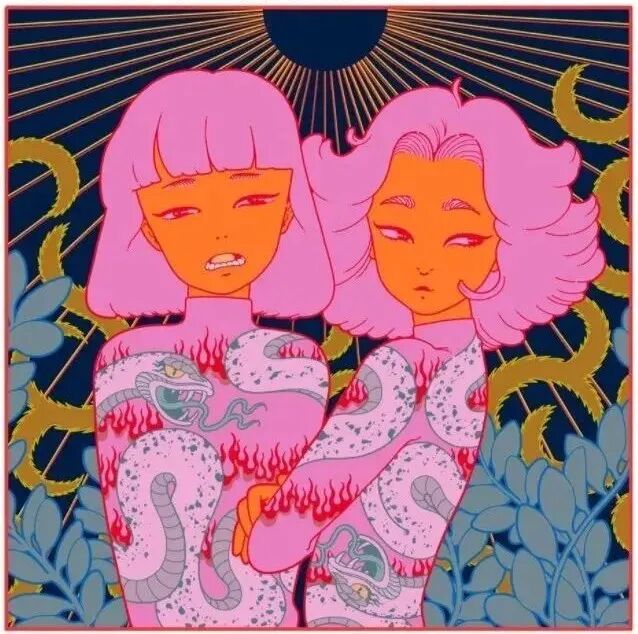 比如上图就是装饰性很强的单幅插画,没有复杂的叙事性,但从两个人的发型、五官表情、眼神、肢体动作上能看出人物的性格设置是不一样的。