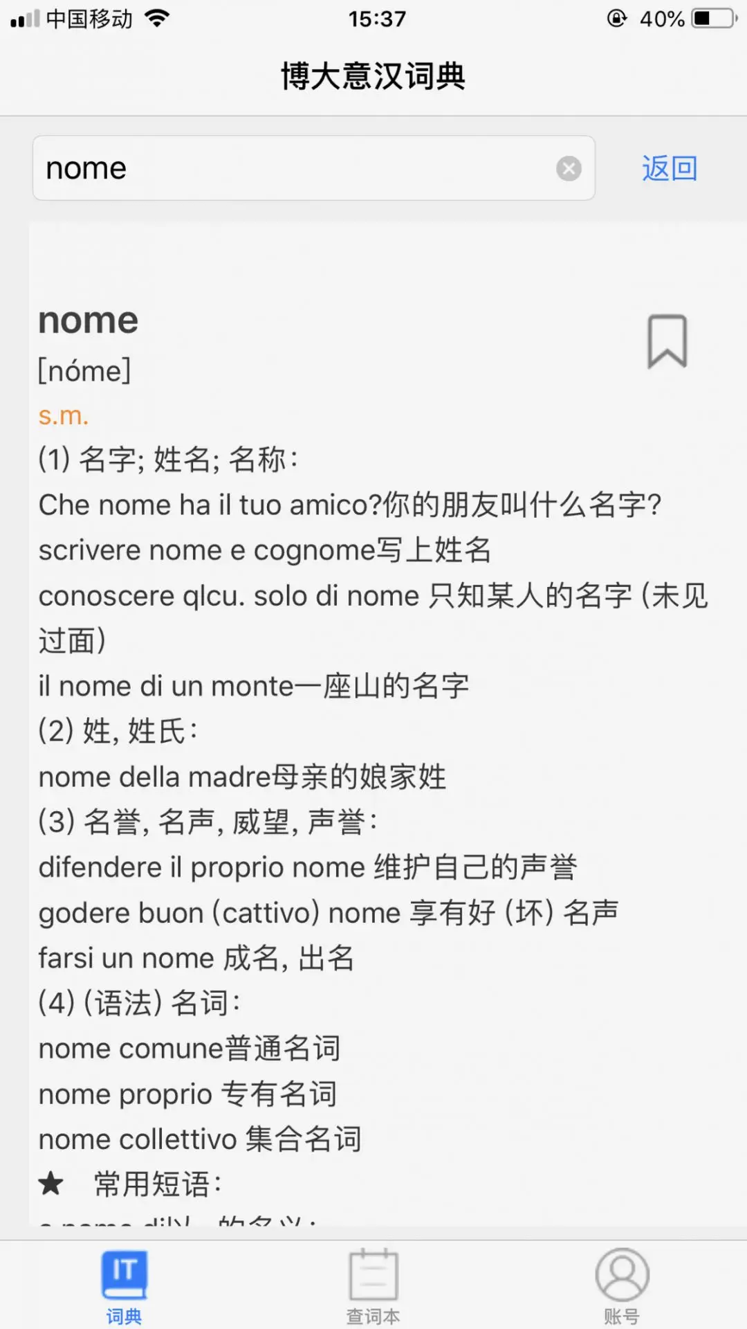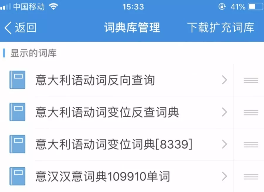 优点:可以任意下载网上所有的词库,都可以扩充,非常方便,可以用中文输入,翻译成意大利语,更重要的是支持查询动词变位!