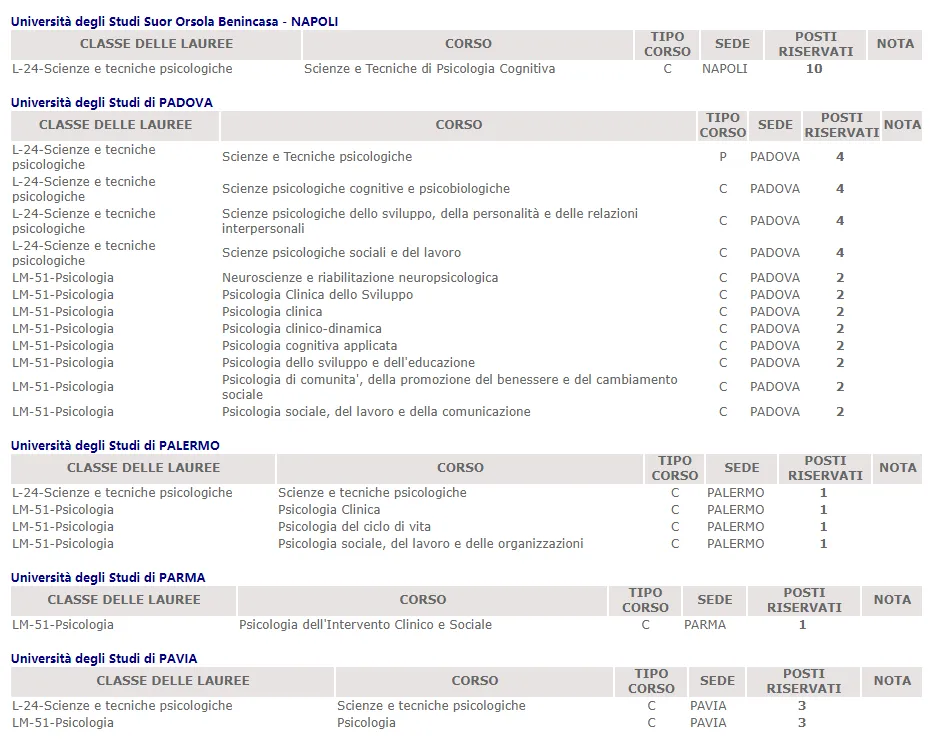 miur部分设有心理学专业的院校