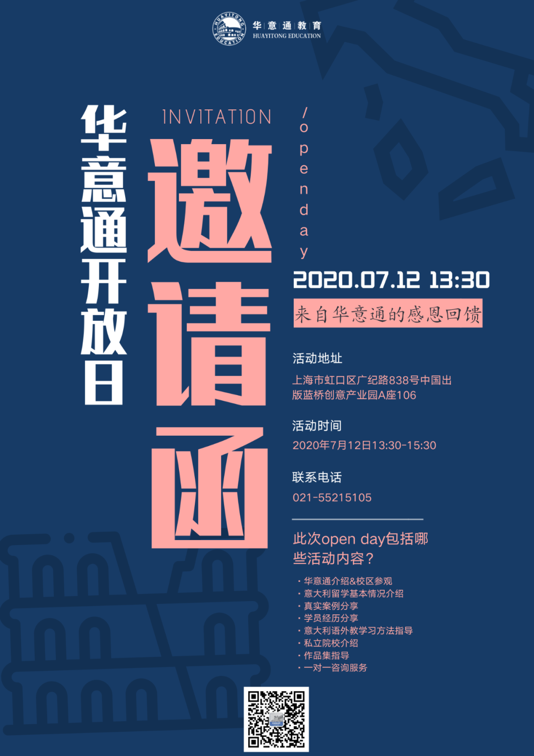 为帮助各位学生及家长更深入地了解意大利留学,能更加放心地选择华意通,华意通教育2020 open day如约而至,诚邀您参与。