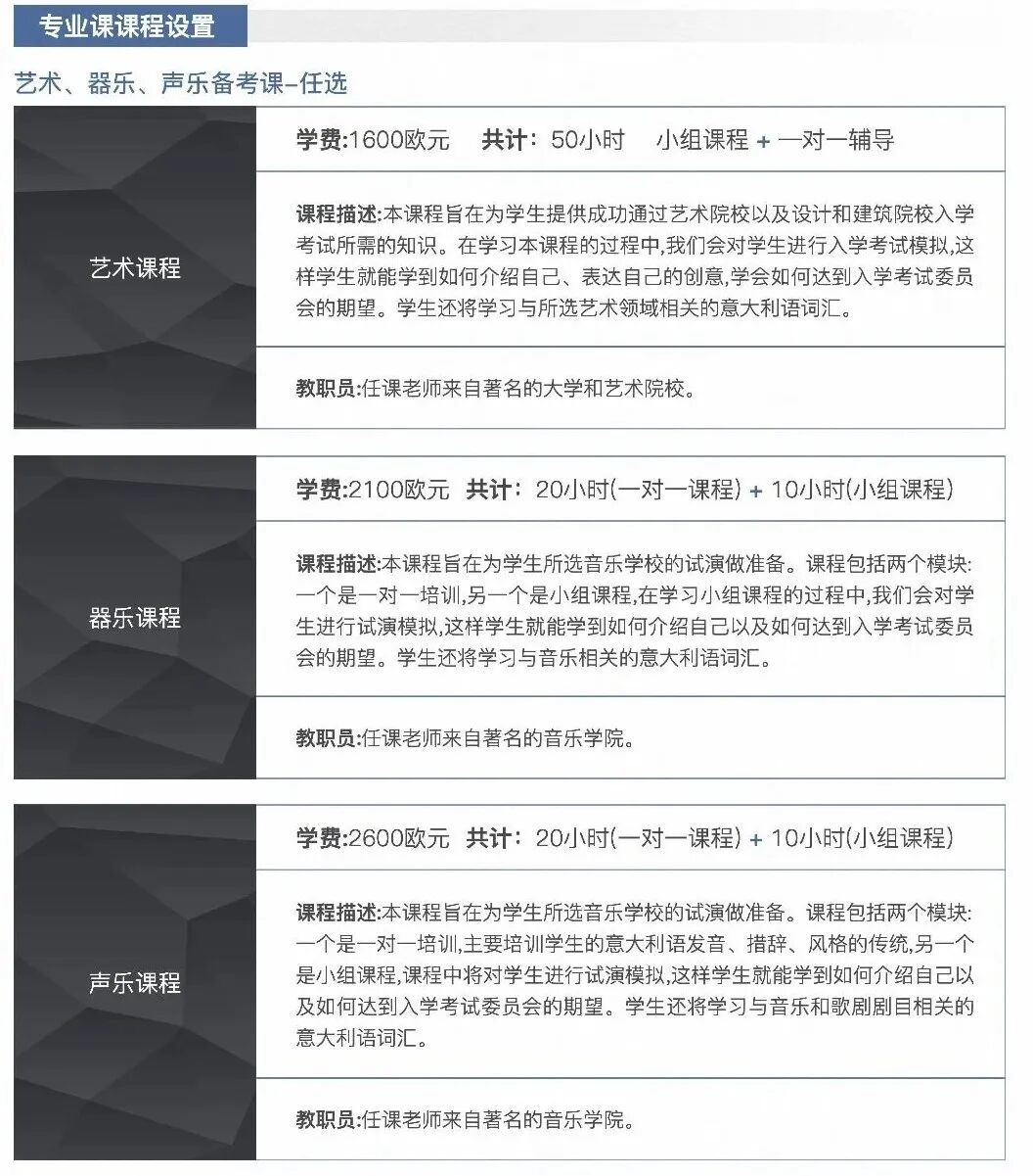 1 意大利语学习中心在开设意大利语培训课程的同时,针对外国学生考取意大利艺术类院校的不足,还开设了艺术类的备考课程,分为美术,设计,音乐等。教授全部来自于与学校合作的艺术类学院等相关机构。具有专业的教学经验和资深的艺术背景2 意大利语学习中心每年还定期举办音乐节,来自欧美国家和中国音乐学院的教授,学生学习音乐知识及大师培训课程3 意大利语学习中心还定期举办游学活动,参与者大多是来自加拿大和美国的学生