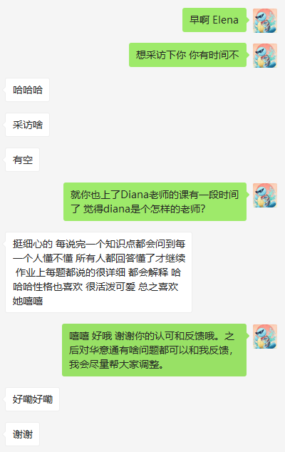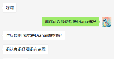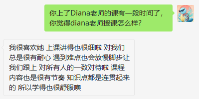 熟悉之后,你就会发现,Diana也太贴心了,提问反而变成一件特别有成就感的事情。越相处就会发现她真的超可爱的,之前我去听了一下,这么可爱的老师都不忍不好好听课!