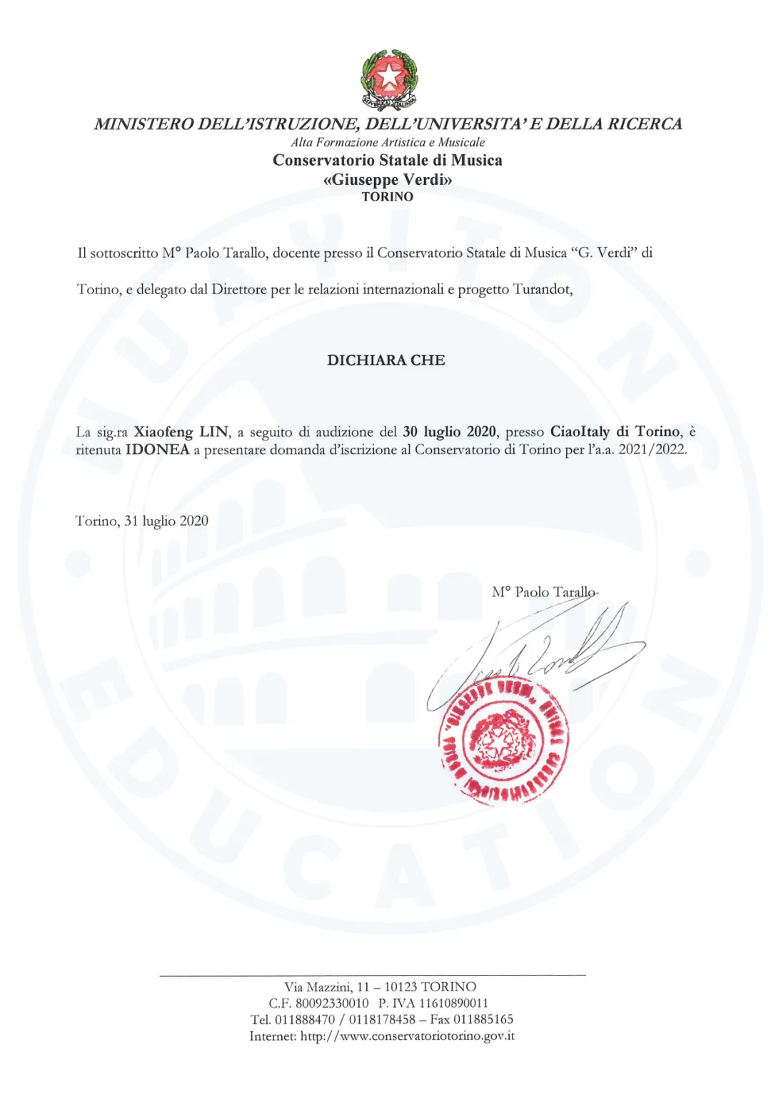 PS:非正式入学考试,但通过线上预选评估,可以优先考虑都灵威尔第正式入学考试的录取。