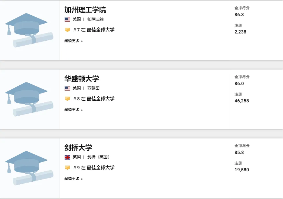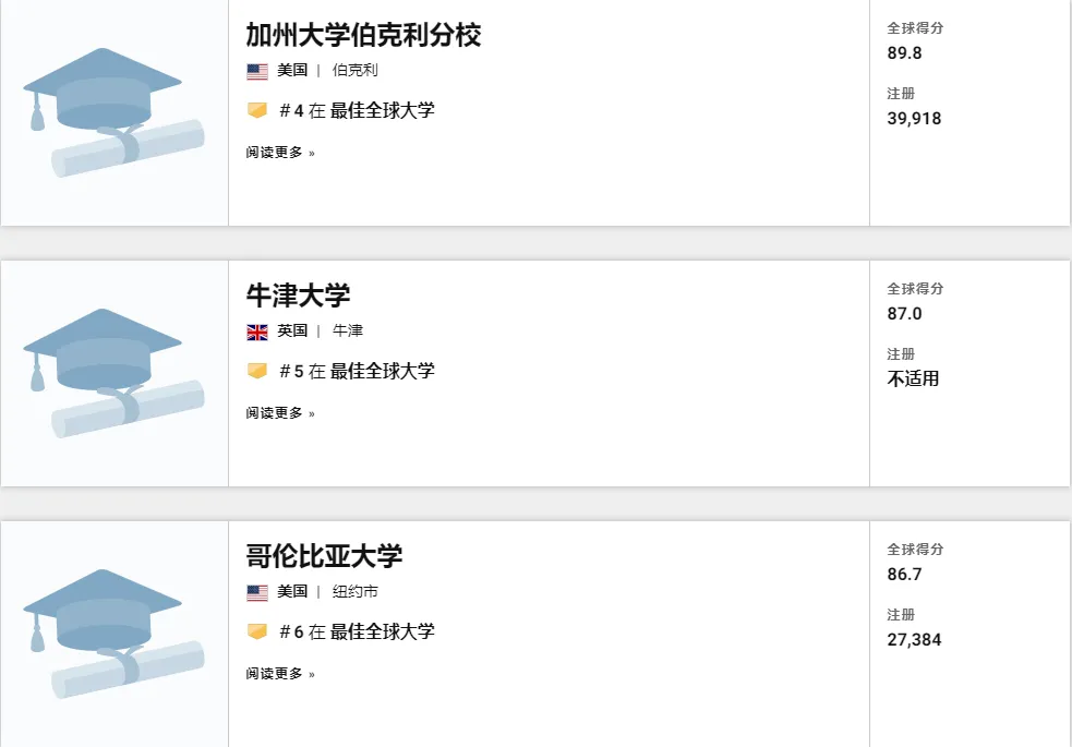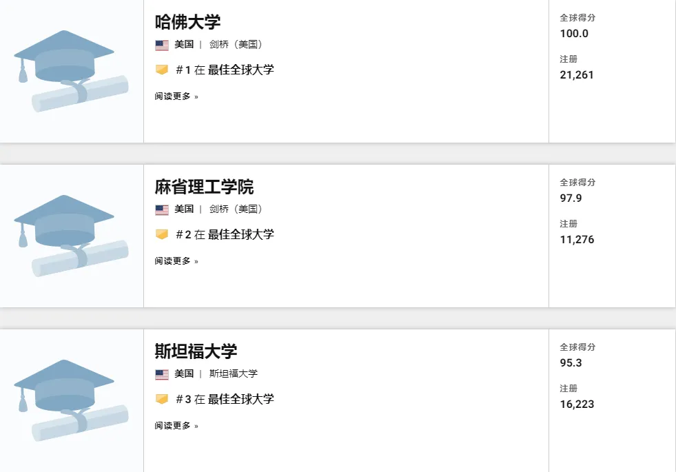 哈佛、麻省理工、斯坦福、伯克利和牛津大学分列前五,名次与去年相比无变化前十最好大学有八所美国大学,两所英国大学。