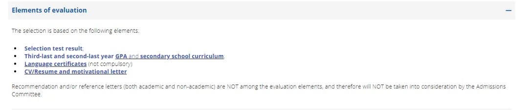 考试成绩(接受考试类型SAT、ACT、Bocconi测试:阅读理解、逻辑、数学、数字推理)占比 55%语言证书(雅思 6,小分不低于 5.5、托福 88) 占比 2%