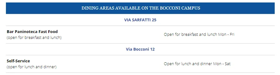 优惠政策:受益于减价食堂服务的学生可以按以下所示的价格在指定区域购买一顿正餐,通常包括第一道菜,第二道菜,配菜,面包,水果或饮料。每天使用Bocconi卡以优惠价享用一日两餐,一份午餐(从11:45到14:30)和一份晚餐(从19:00到20:30)。