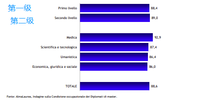 获得硕士学位毕业一年后,总就业率的是88.6%,一级硕士是88.4%,二级硕士是89%。