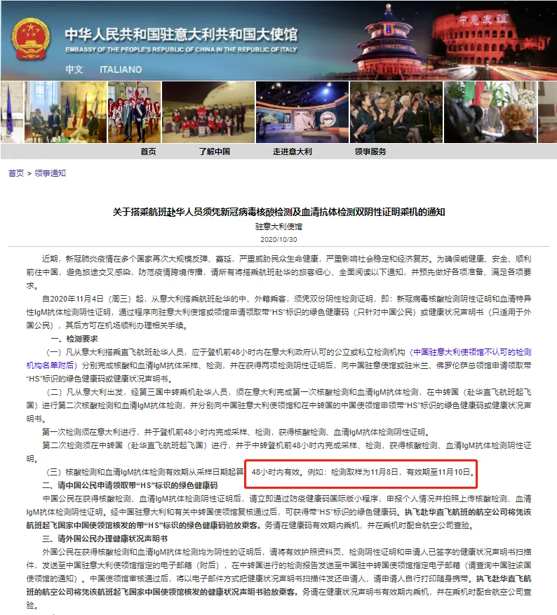 自2020年11月4日(周三)起,从意大利搭乘航班赴华的中、外籍乘客,须凭双份阴性检测证明,即:新冠病毒核酸检测阴性证明和血清特异性IgM抗体检测阴性证明,通过程序向驻意大利使馆或领馆申请领取带“HS”标识的绿色健康码(只针对中国公民)或健康状况声明书(只适用于外国公民),其后方可在机场顺利办理相关手续。