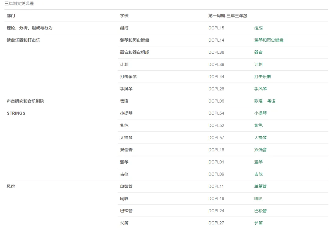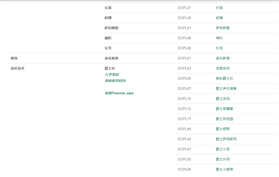 竖琴、声乐、吉他、单簧管、大键琴和古键盘乐器、作曲、低音提琴、圆号、音乐教学、巴松、手风琴、长笛、双簧管、管风琴、钢琴、打击乐器、中提琴、小提琴、大提琴等等