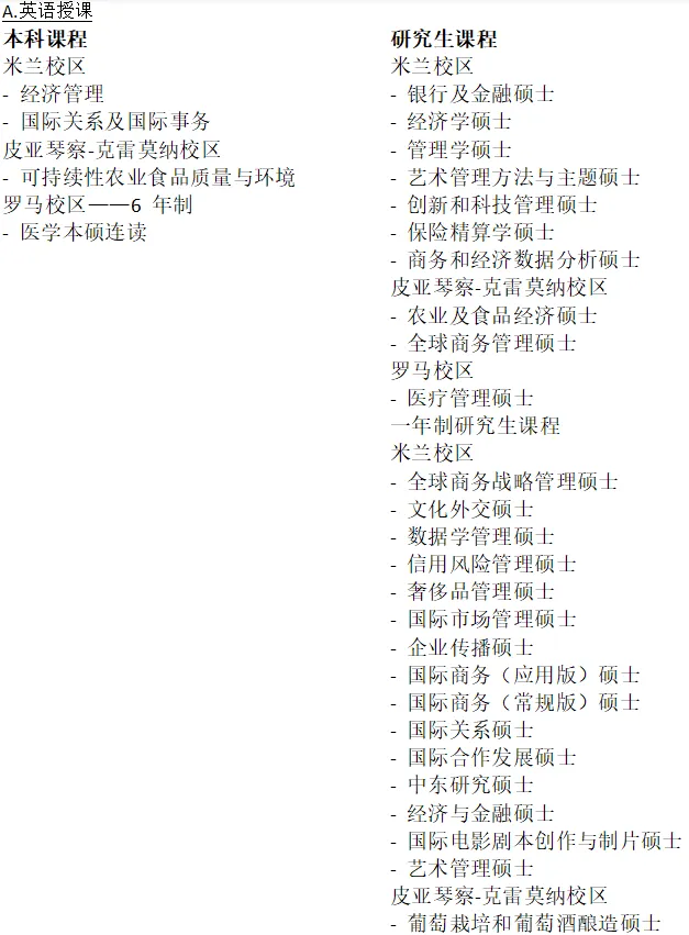 3. 经济学院课程(SAT 成绩需达到560 或参加米兰TIEC 考试)