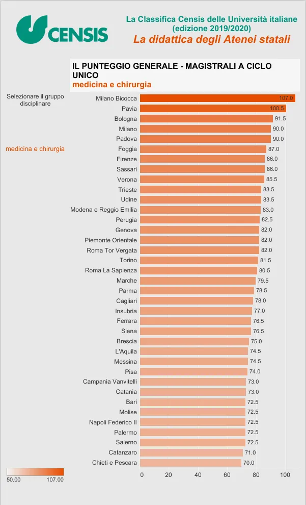 而根据意大利权威调查机构censis2019/2020排名,在医学与外科(medicina e chirurgia)方面,米兰比可卡大学以107分的高分位列第一,帕维亚大学和博洛尼亚大学紧随其后。