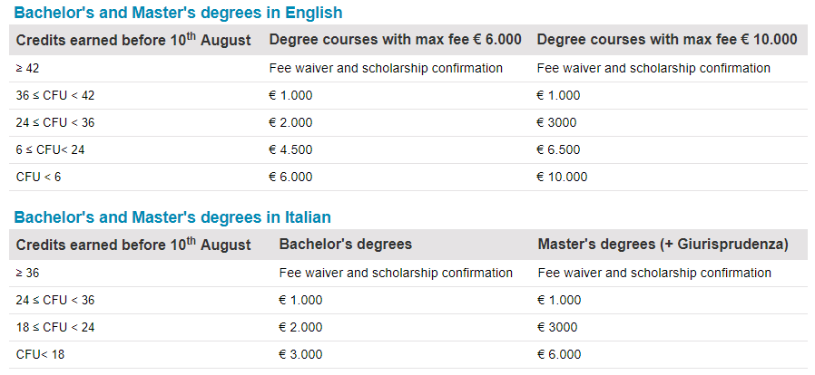 如果你是本学年或硕士学位的第一年首次入学,可以获得助学金,根据家庭收入情况(即ISEE值)获得减免。如果第二年也想拿到助学金,必须在第一年达到预期的20个学分。