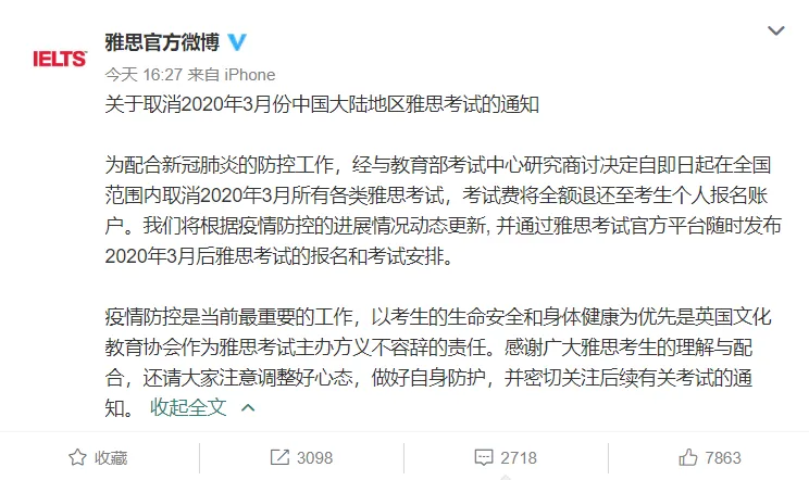 "经与教育部考试中心研究商讨决定自即日起在全国范围内取消2020年3月所有各类雅思考试,考试费将全额退还至考生个人报名账户。将根据疫情防控的进展情况动态更新, 并通过雅思考试官方平台随时发布2020年3月后雅思考试的报名和考试安排。"