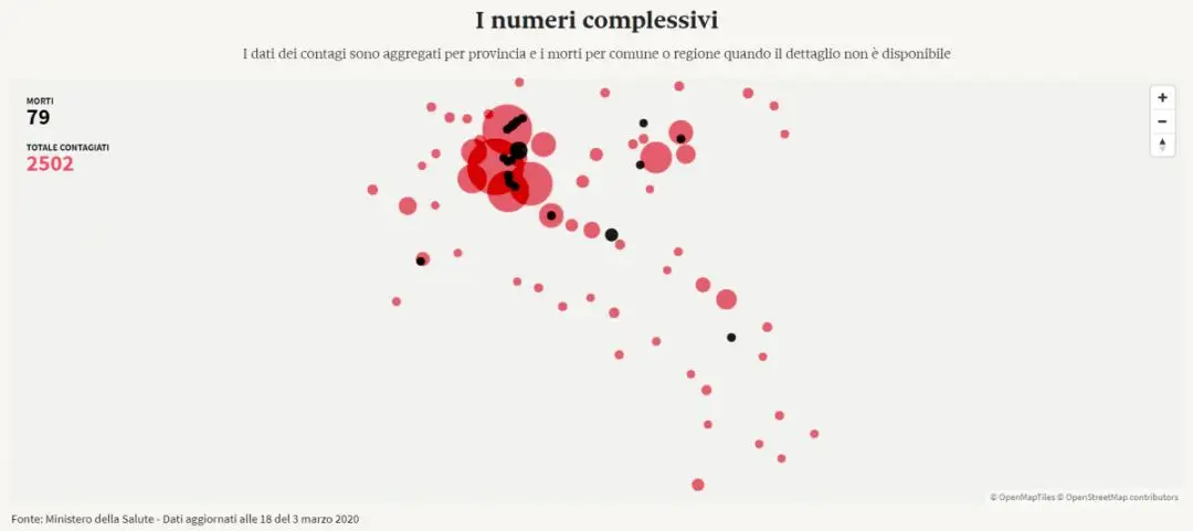 从地图可以看出,感染患者和死亡病例基本集中在北部伦巴第大区,然后呈发散状。