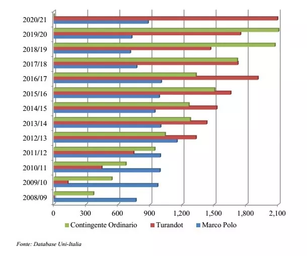 · 2008/2009学年至2020/2021学年中国学生通过国际生、马可波罗图兰朵计划赴意留学人数趋势