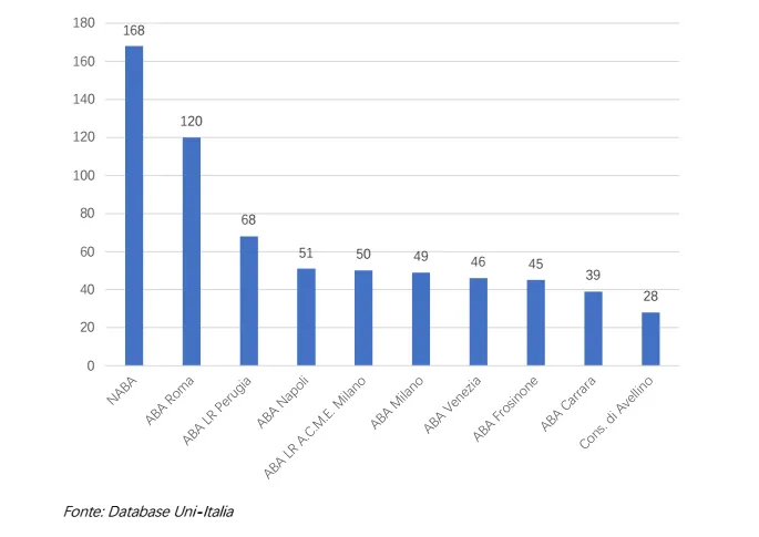 预注册人数前十位艺术院校分别为:米兰新美术学院、罗马美术院校、佩鲁贾美术学院、那不勒斯美术学院、米兰A.C.M.E.美术学院、米兰布雷拉美术学院、威尼斯美术学院、弗洛西诺内美术学院、卡拉拉美术学院、阿维利诺音乐学院。