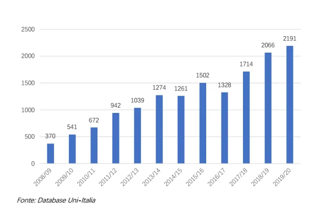 中国去意大利留学的学生数量呈持续上涨趋势,在2019年度突破五千人。自2008/2009学年至今,中国国际生预注册人数增长了600%。