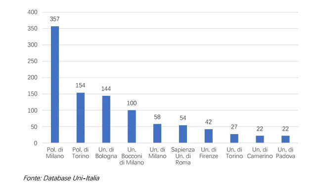 预注册人数前十位综合类大学分别为:米兰理工大学、都灵理工大学、博洛尼亚大学、博科尼大学、米兰大学、罗马一大、佛罗伦萨大学、都灵大学、卡梅里诺大学、帕多瓦大学。