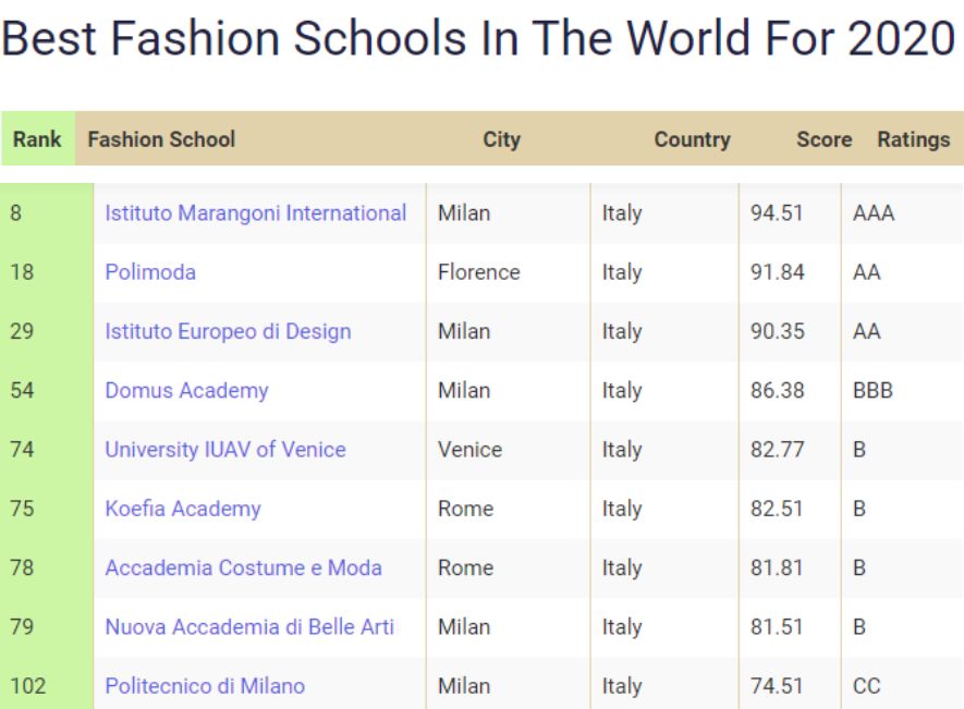 米兰已经成为炙手可热的时尚之都,当然上榜的还有罗马和佛罗伦萨。这些都是时尚院校所在地。
