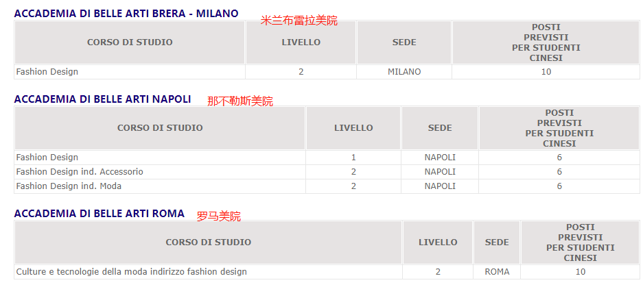 服装相关:面料设计(欧设/NABA)、服装设计(基本院校都有)、服装制版(卡罗世纪服装学院)、戏剧服装设计(罗马服装学院)、服装造型(马兰欧尼)