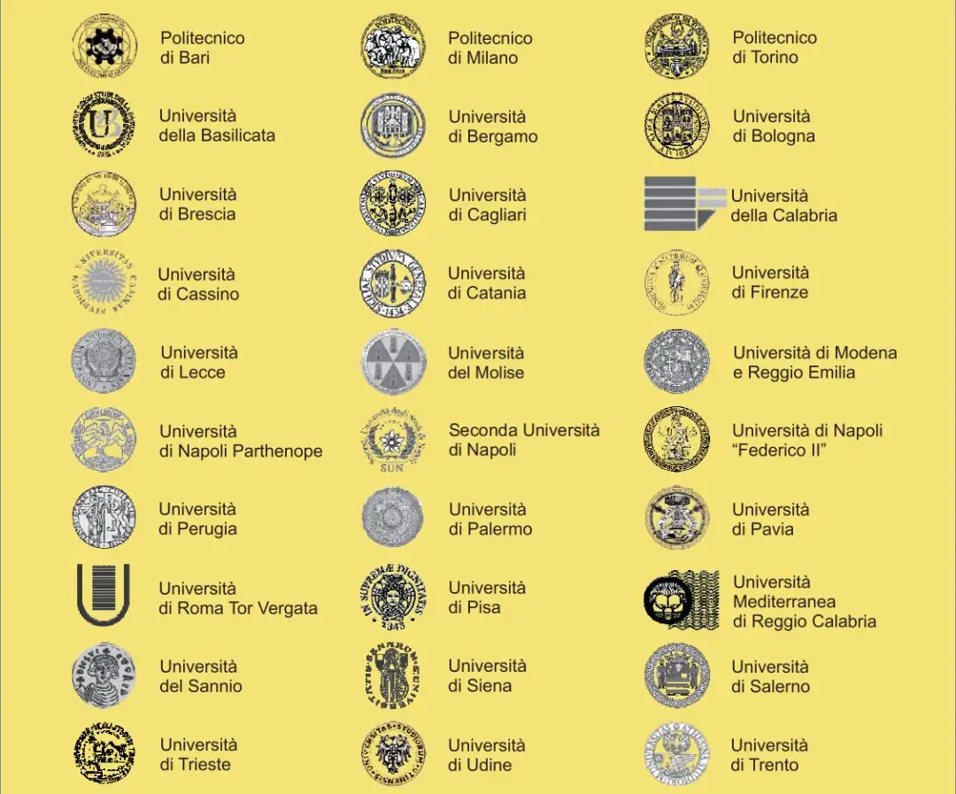 米兰理工大学、都灵理工大学、博洛尼亚大学、佛罗伦萨大学、威尼斯东方大学、都灵大学、米兰大学、米兰比克卡大学、罗马一大、罗马二大、罗马三大、帕维亚大学、帕尔马大学、威尼斯建筑大学、佩鲁贾大学、佩鲁贾外国人大学、锡耶那大学、锡耶那外国人大学、比萨大学、热那亚大学、摩德纳大学、特伦托大学、帕多瓦大学、维罗纳大学等等