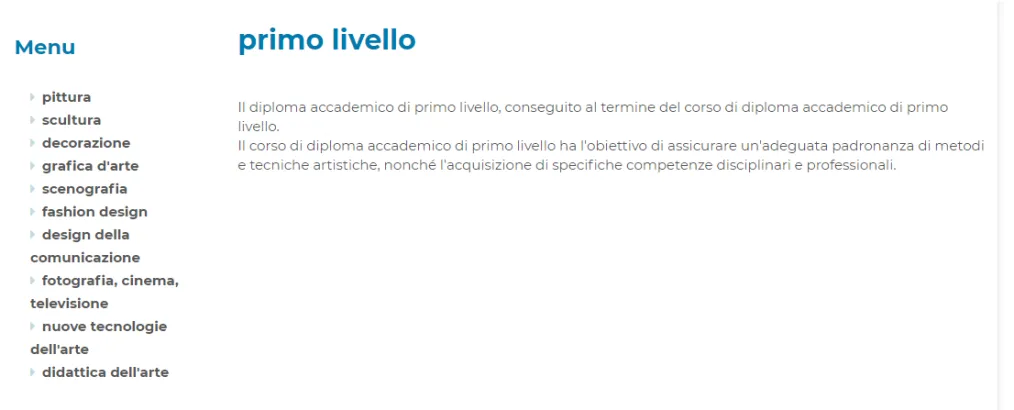 米兰布雷拉美术学院、佛罗伦萨美术学院、罗马美术学院、博洛尼亚美术学院、威尼斯美术学院、都灵美术学院、那不勒斯美术学院、佩鲁贾美术学院、米兰新美术学院、卡拉拉美术学院
