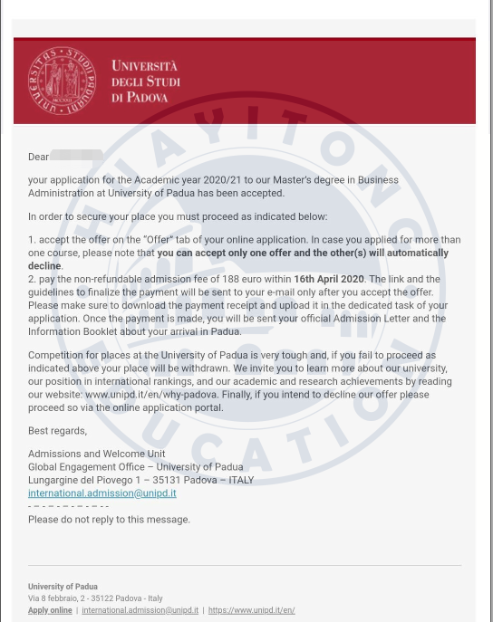 帕多瓦大学录取offer