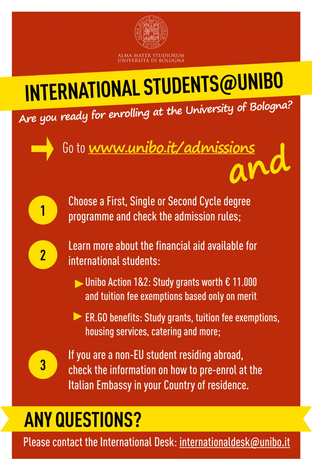 博洛尼亚大学的老师和工作人员针对2020/2021学年国际学生,不仅安排有专门的录取及注册线上交流时间(International Desk Sessions),还将按大洲划分,安排与博洛尼亚大学的各大洲在读或毕业生线上交流时间(International Café)。