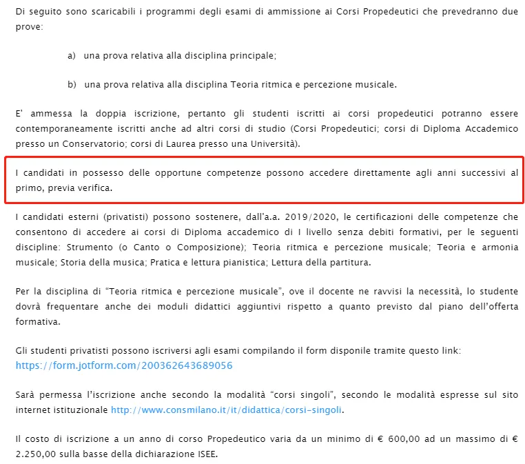 这里需要注意的一点,像米兰威尔第音乐学院的Corsi Propedeutici,当你上完课程后,非常优秀地通过了相关测试,教授觉得你完全有实力进入米兰音乐学院,是可以直接注册本科或研究生课程的(毕竟你都通过了这个测试,得到了教授的认可,入学考试肯定也不在话下)。