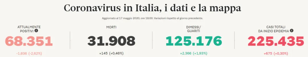 最后还是来看看意大利疫情的最新数据(截至5.17 18:00)。