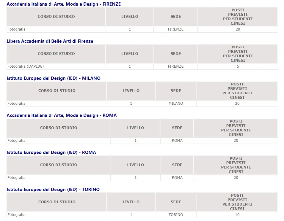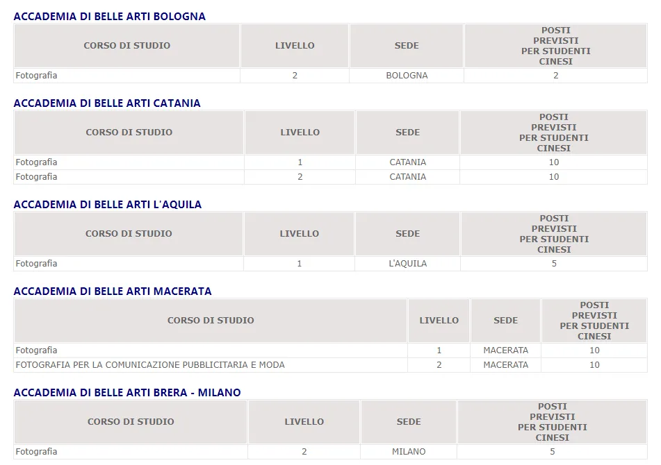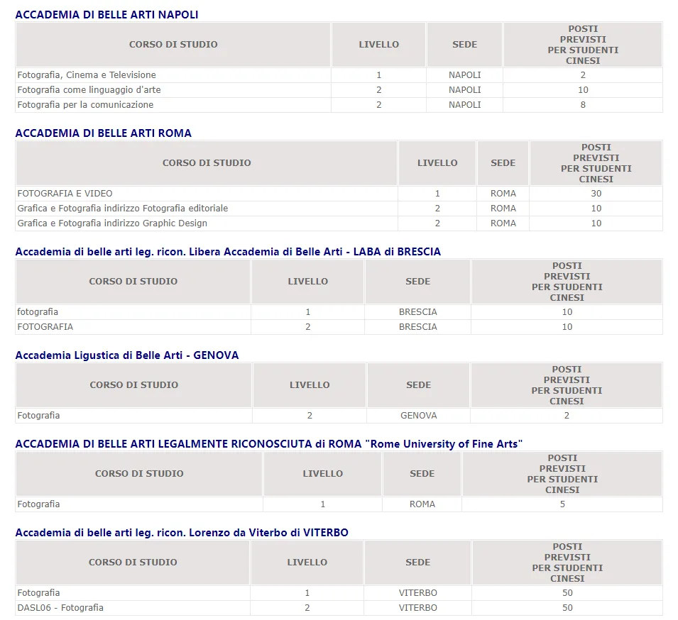 在意大利大学中,一般只有艺术类院校设有摄影专业,包括意大利公立美术学院和部分私立院校(综合类大学的DAMS专业或电影电视多媒体专业里会涉及到摄影课程)。