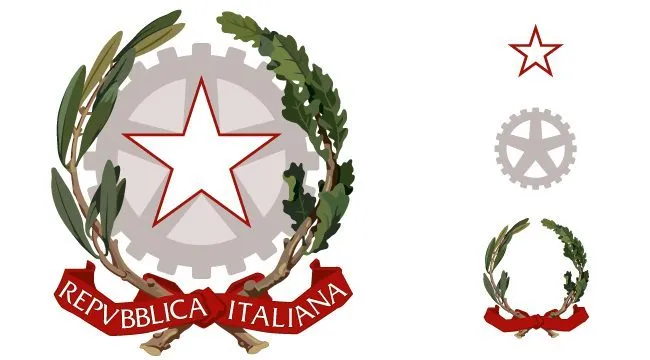 齿轮周围由象征和平的橄榄和象征力量和尊严的橡树枝条环绕。底部的红色绶带上用意大利文写着“意大利共和国”。