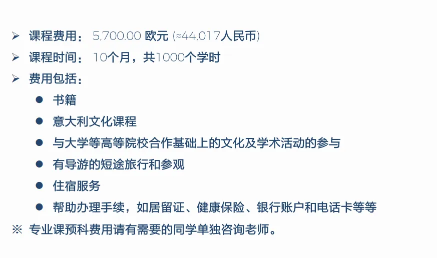 该课程将由专业老师进行,讲授内容包括音乐与艺术术语、意大利艺术音乐史、在意大利大学学习的基本语言技能教学、意大利文化等等。另外安排学生参观展览及博洛尼亚城内活动。